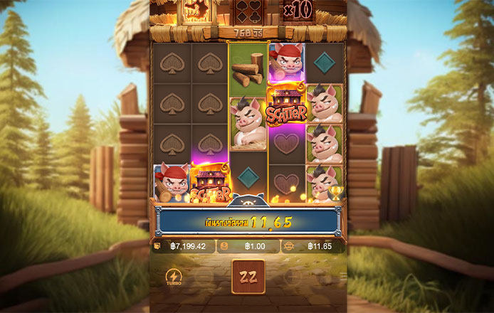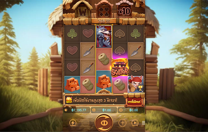 ![]() | สัญลักษณ์ PIG WILD จะมีโอกาสปรากฏเฉพาะบนรีลที่ 3 เท่านั้น โดยเมื่อปรากฏขึ้น สัญลักษณ์หมาป่าที่อยู่บนวงล้อจะถูกเปลี่ยนให้กลายเป็นสัญลักษณ์ WILD และยังสามารถสะสมเพื่อปลดล็อกโบนัสตัวคูณเงินรางวัลเพิ่มเติมได้อีกด้วย |